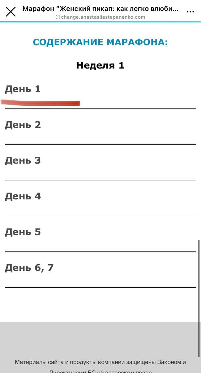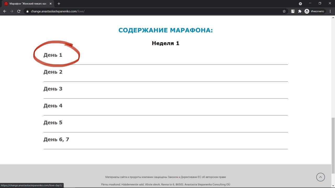 Внизу, после информации про марафон/курс, вы найдёте содержание. Выберите то занятие, которое хотите пройти, и нажмите на него: