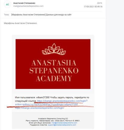 Вы открываете письмо от «Анастасия Степаненко mail@anastasiiastepanenko.com». В нём есть ссылка, по которой вы можете задать пароль: