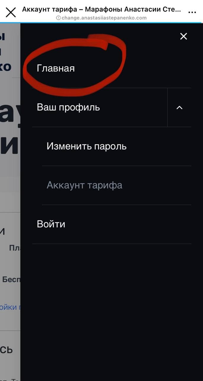 После входа в систему нажмите на три чёрточки в правом верхнем углу (это меню), а затем на «Главная»:
